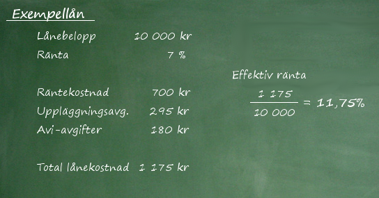 Exempel: Du tar ett lån på 1000 kr som du betalar tillbaka inom 30 dagar. Återbetalningen du krävs på är 1 125 kr. Din absoluta kostnad i kronor är 125 kr. Den beräknade effektiva årsräntan blir då 319%.